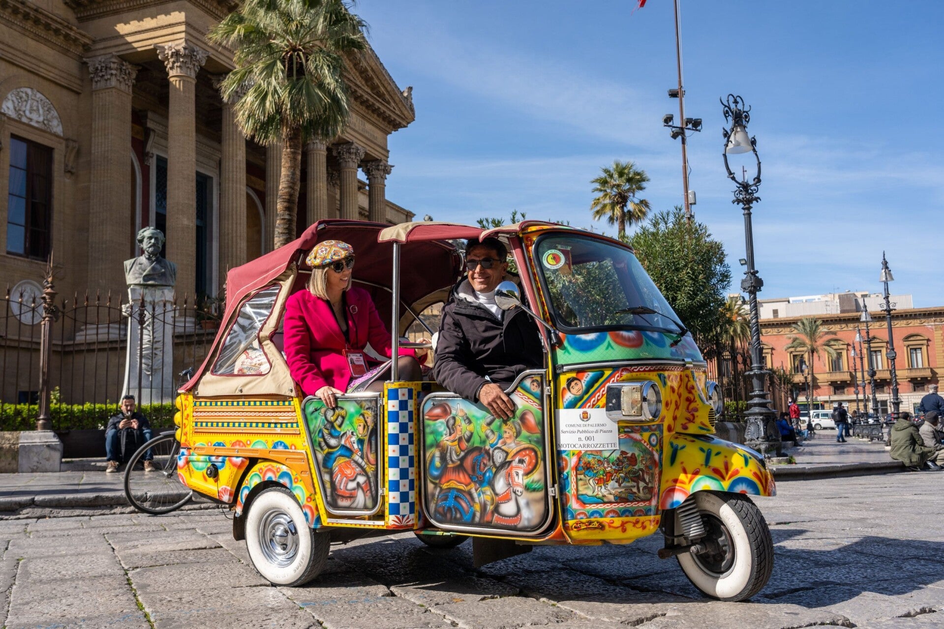 Si prosegue verso il maestoso Teatro Massimo, con la sua imponente facciata neoclassica che si affaccia su Piazza Verdi, e poi verso il Politeama, cuore elegante e moderno di Palermo, dove la vita cittadina scorre tra caffè, musica e risate. Lungo Via Roma, una delle arterie principali della città, l'Ape Taxi attraversa un paesaggio urbano di architetture liberty, vetrine storiche e il flusso costante di persone che anima Palermo.